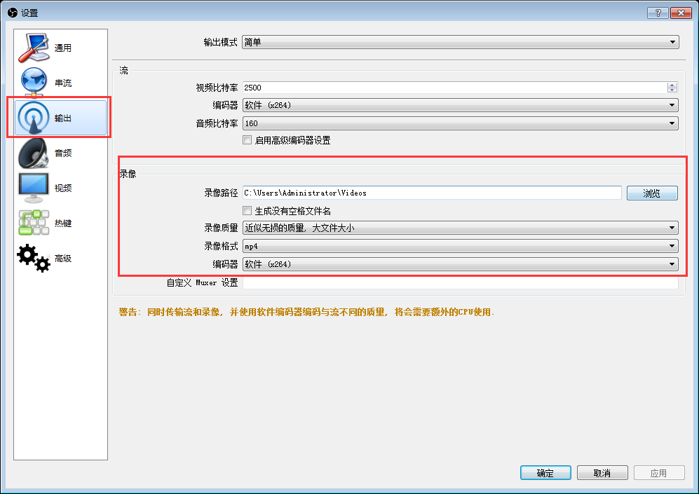 7. OBS Studio視頻錄制,點擊“設置”,在彈出的視窗中,點擊“輸出”,選擇錄像存儲的位置,錄像質量,錄像保持的格式后,回主界面點擊開始錄制,進行視頻錄制
