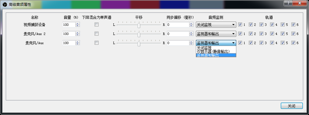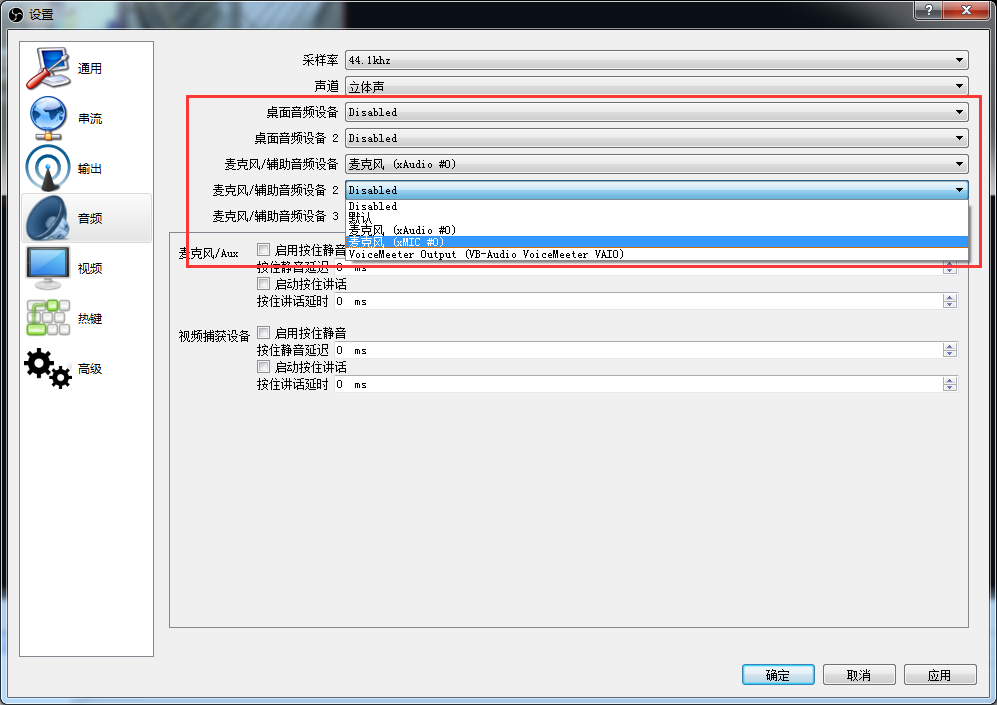 選擇音頻,將“麥克風/輔助音頻設備”選擇采集卡設備,如果采集卡帶有MIC音頻輸入,在麥克風/輔助音頻設備2選擇采集卡MIC設備(沒有MIC輸入接口請忽略此步),其他的選Disabled