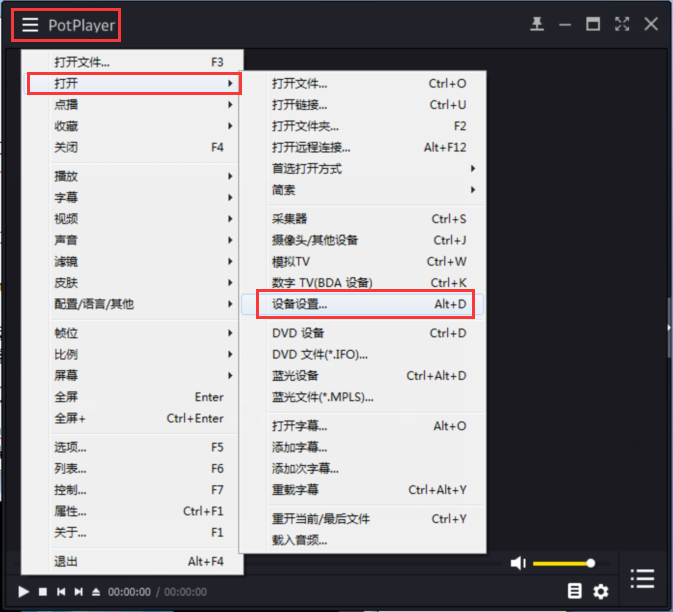 3. 雙擊打開PotPlayer軟件,點擊左上角“PotPlayer”圖標彈出下拉欄窗口選擇“打開”,在彈出的窗口中點擊“設備設置”,也可直接使用快捷鍵Alt+D來打開“設備設置”。