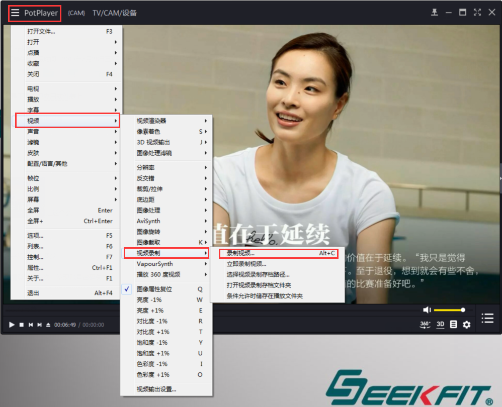 5. 點擊左上角“PotPlayer”圖標彈出下拉欄窗口選擇“視頻”,在彈出的窗口中點擊“視頻錄制”,在彈出的窗口中點擊“錄制視頻”,也可直接使用快捷鍵Alt+C來打開“錄制視頻”