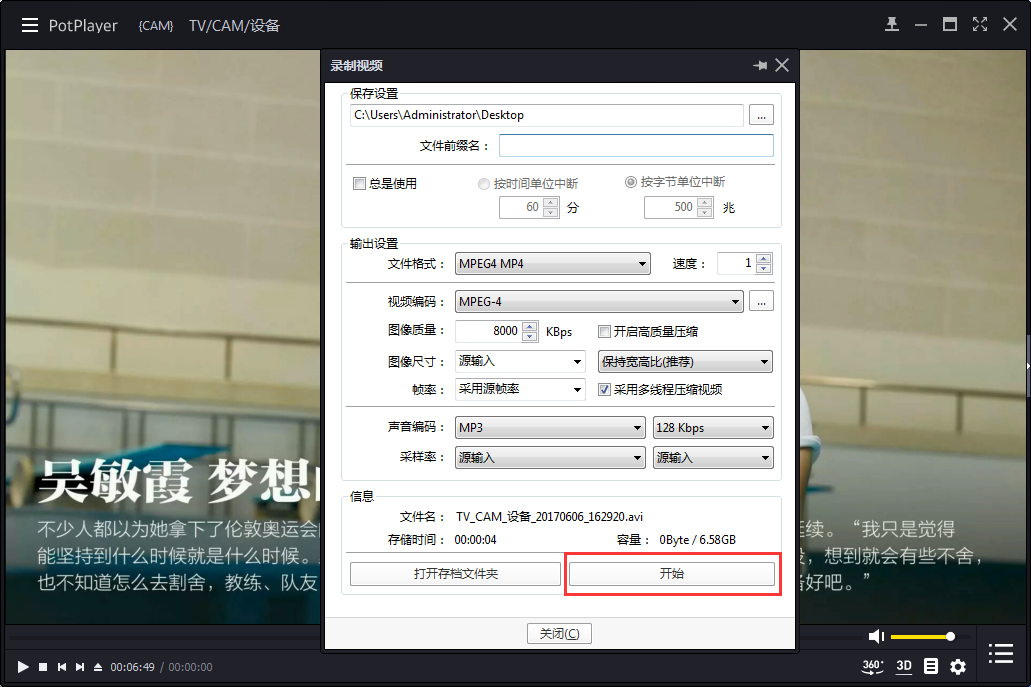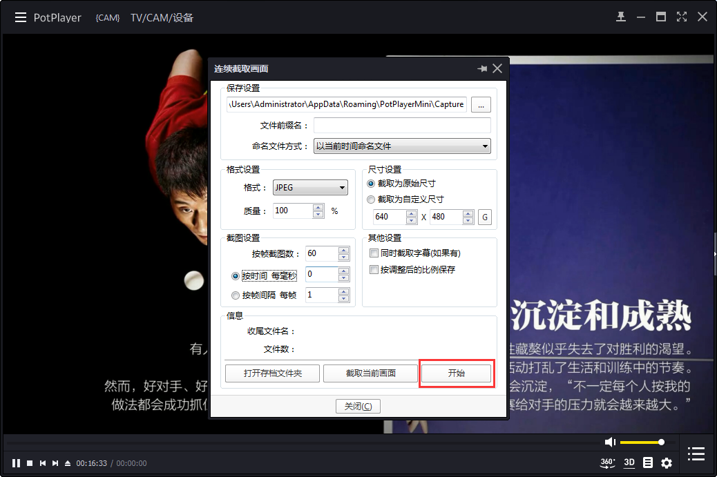 8. 設置截取畫面保存的位置,文件名,圖片的格式,圖片的質量,圖片的尺寸,截取的張數,截取的頻率等,設置完成后點擊“開始”,開始截取畫面