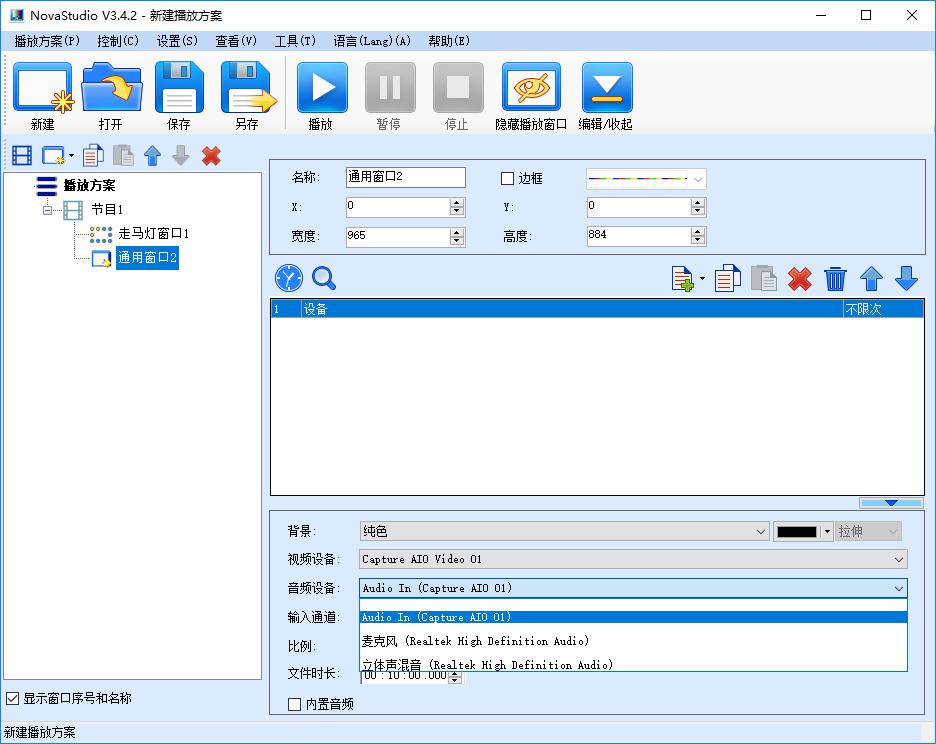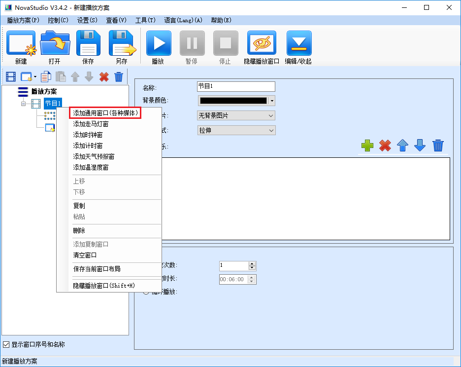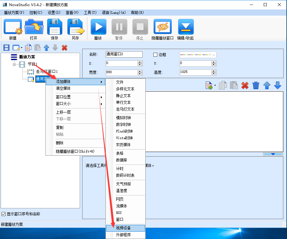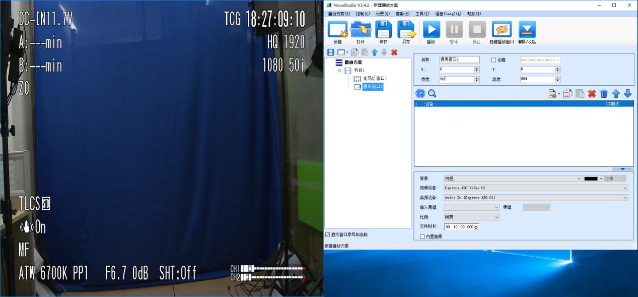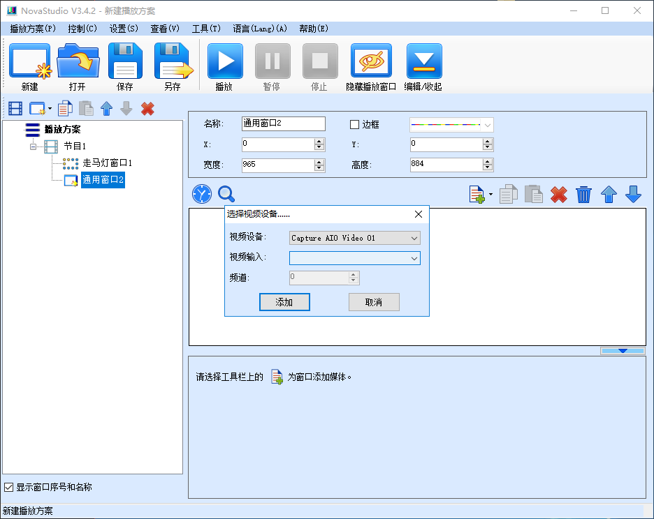 3. 采集卡安裝好接上信號源并啟動NovaStudio,新建節目,在節目里添加通用窗口