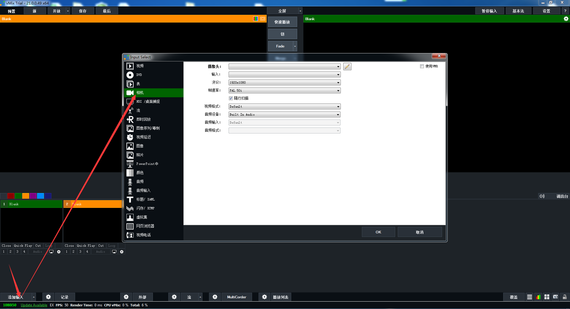 2. 啟動vMix,點擊“添加輸入”,再點擊相機;