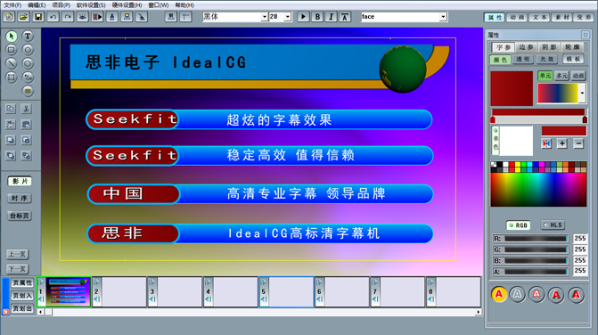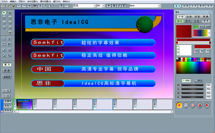 含千種多種可自由設計調整參數(多數可逐字飛行或變化)的入出場效果.60多種停留飛光動畫, 100多種頁動畫.可簡單的自由組成上萬種超炫實時動畫效果!包含淡入/分子效果/放射效果/手寫效果/各式3D效果/模糊發亮/方向性模糊加發亮/各式飛行/飛行拖影/各式變形/移入/拉入/各式雨刷/圖帶字效果/碎塊效果/自然彈跳/ 卷頁翻頁…等. 全國獨首創的“實物劃像”方式的設計,使劃像動畫可任意擴充.全國獨首創的“粒子動畫”效果的應用文字動畫更加豐富多彩.
