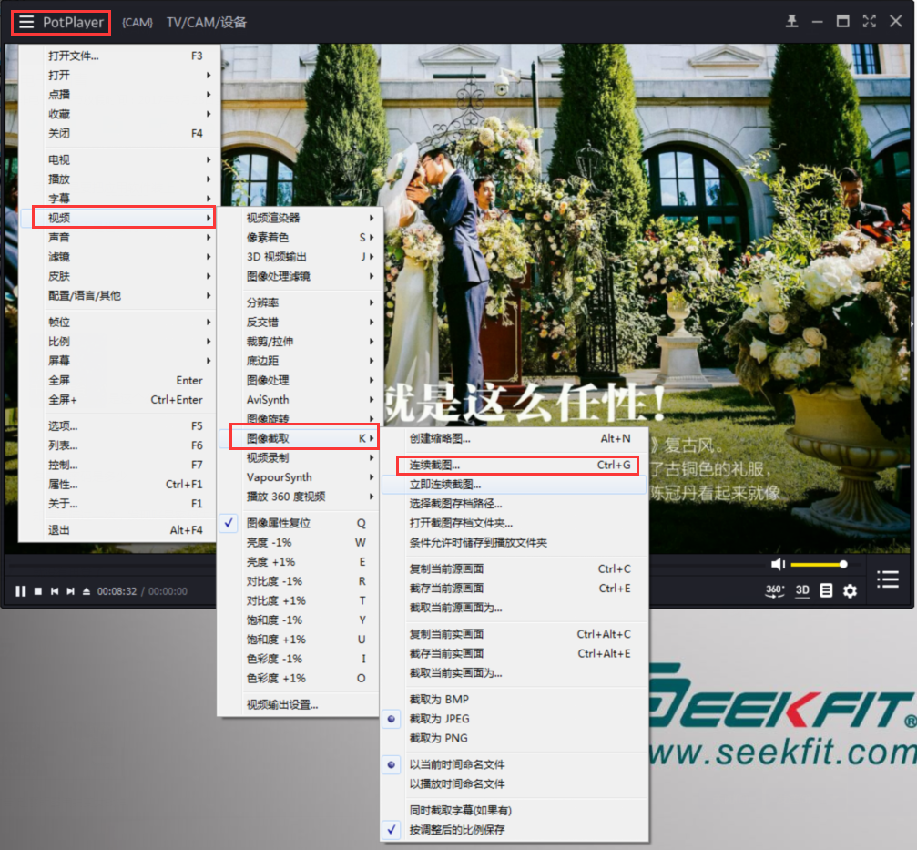 7. 點擊左上角“PotPlayer”圖標彈出下拉欄窗口選擇“視頻”,在彈出的窗口中點擊“圖像截取”,在彈出的窗口中點擊“連續截取”,也可直接使用快捷鍵Ctrl+G來打開“連續截圖”